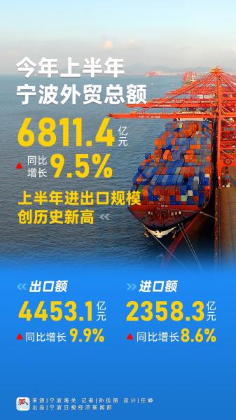 上半年,寧波外貿(mào)總額為6811.4億元,比去年同期增長9.5%。