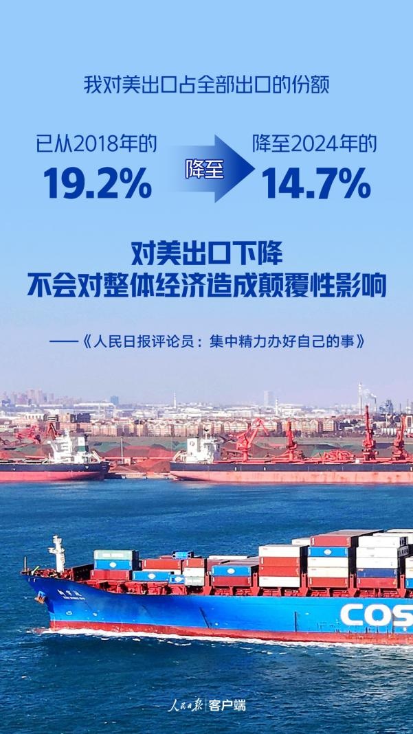 但要看到,中國是超大規模經濟體,面對美國的關稅霸凌沖擊,我們具有強大的抗壓能力。近年來我們積極構建多元化市場,對美市場依賴已在下降。我對美出口占全部出口的份額已從2018年的19.2%降至2024年的14.7%,對美出口下降不會對整體經濟造成顛覆性影響。美國內不少產品對我依存度較高。當前美國不僅在很多消費品上離不開中國,很多投資品和中間產品也需要從中國進口,有若干品類依存度超過50%,短期內在國際市場上很難找到替代來源。在全球產供鏈深度交融的大背景下,中美貿易不可能完全中斷。新興市場經貿合作潛力巨大,日益成為我穩外貿的重要基礎。我國是全球150多個國家和地區的主要貿易伙伴,2018年以來,我對東盟出口占比由12.8%提升到16.4%,對共建“一帶一路”國家出口占比由38.7%提升到47.8%,且保持較快增長勢頭。國內市場緩沖空間廣闊,是重要的大后方。據統計,2024年我有出口實績的數十萬家企業中,接近85%的企業同時開展內銷業務,內銷金額占銷售總額的近75%。國家正加快打通“出口轉內銷”政策堵點、卡點,擴內需各項政策也在加力擴圍,內需市場的容納效應將日益顯現。