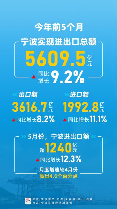 今年前5個月,寧波實現進出口總額5609.5億元,同比增長9.2%。其中,出口額3616.7億元,同比增長8.2%;進口額1992.8億元,同比增長11.1%。